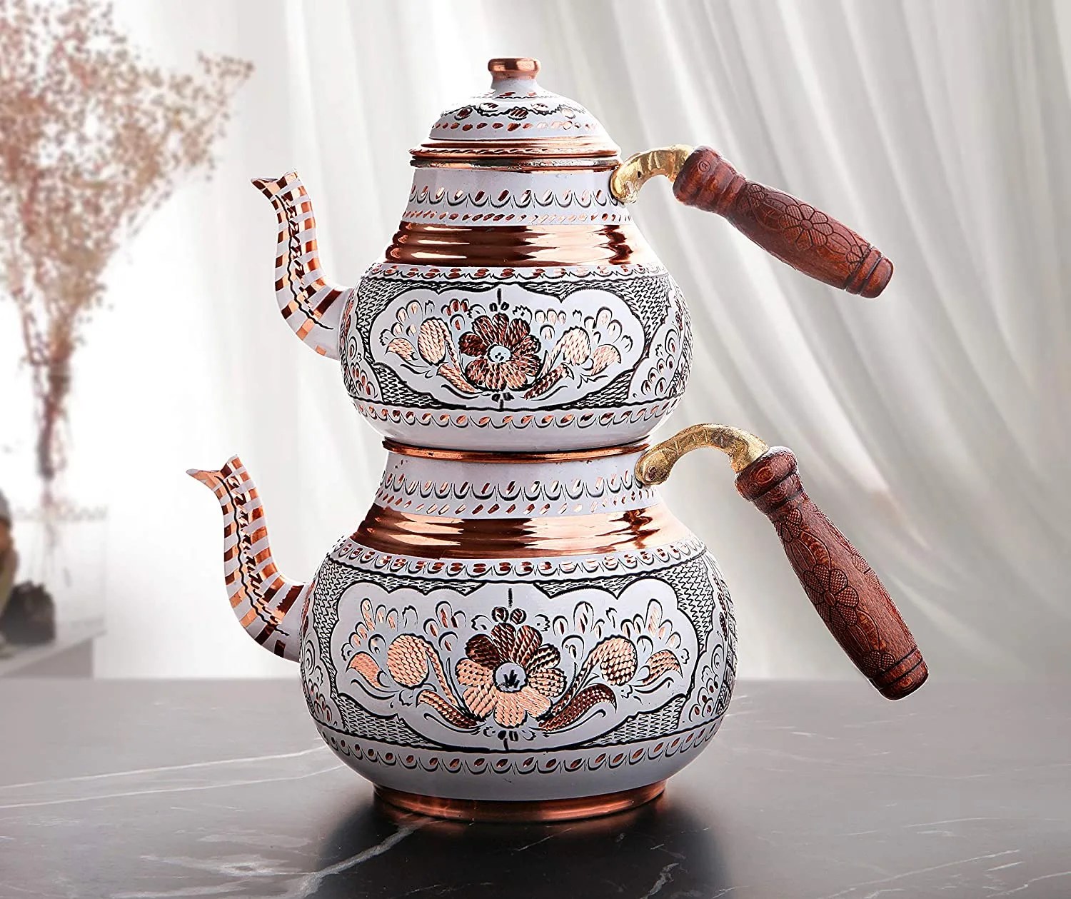 Turkish Style Double Teapot Set, White with Red Polka Dots, Gold Trim, 34 oz and 67 oz