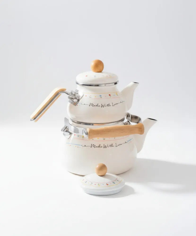 Turkish Style Double Teapot Set, White with Red Polka Dots, Gold Trim, 34 oz and 67 oz